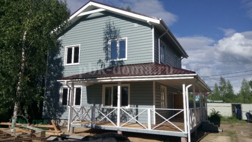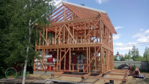 В стоимость дома вошло: двойная обвязка (обработана антисептиком), каркас из доски 50х200 мм (обработан антисептиком), стропильная система и межэтажные перекрытия обработаны антисептиком, утепление 200 мм, наружная отделка имитация бруса покрашена, кровля металлочерепица, окна ПВХ, входная дверь, внутренней отделки нет, внутренних дверей нет, водосточная система, доставка, сборка.