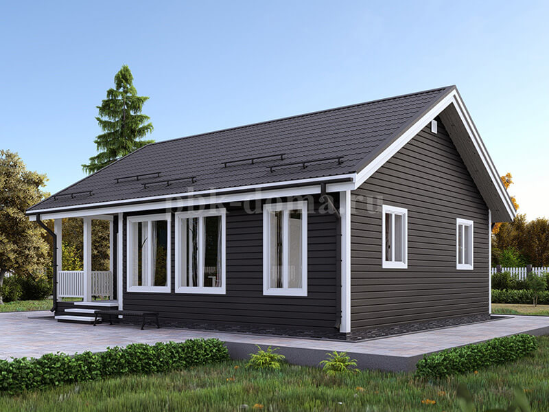 Высокая функциональность планировки обеспечивает комфорт каждого жильца. В доме предусмотрен тамбур для хранения верхней одежды и обуви. Выделено помещение под котельную, что позволяет использовать любые виды отопительного оборудования – от газовых до твердотопливных котлов. Жилой блок состоит из проходной гостиной, двух уединенных спален, просторной кухни и санузла.