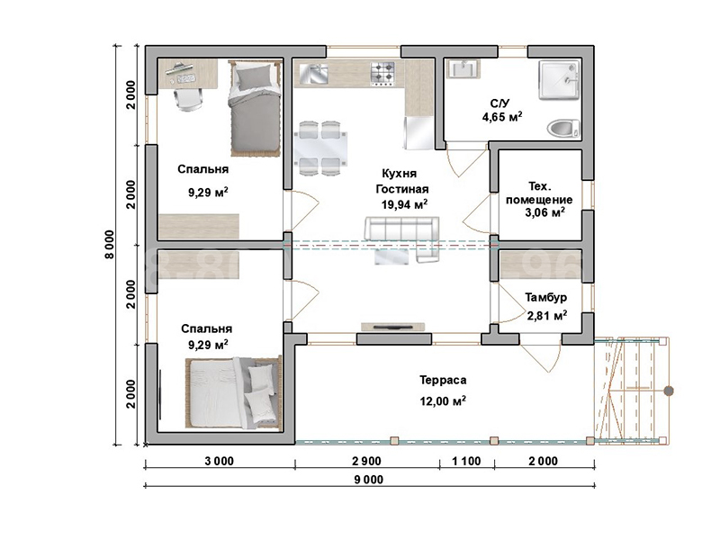 Центральное место в доме занимает просторная (20 кв.) кухня-гостиная. Есть также 2 спальни (одну можно переоборудовать под детскую комнату или рабочий кабинет), просторный санузел и техническое помещение, где можно установить отопительный котел и другое оборудование. Все помещения разделены каркасными перегородками, предусмотрена качественная звукоизоляция.