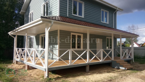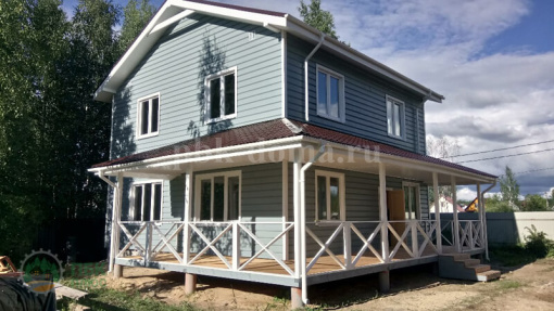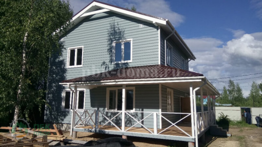 В стоимость дома вошло: двойная обвязка (обработана антисептиком), каркас из доски 50х200 мм (обработан антисептиком), стропильная система и межэтажные перекрытия обработаны антисептиком, утепление 200 мм, наружная отделка имитация бруса покрашена, кровля металлочерепица, окна ПВХ, входная дверь, внутренней отделки нет, внутренних дверей нет, водосточная система, доставка, сборка.