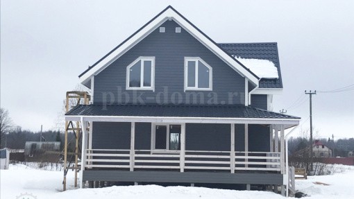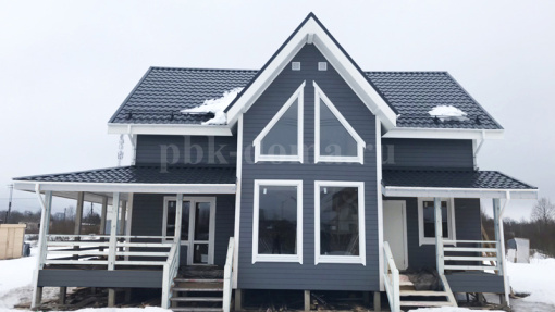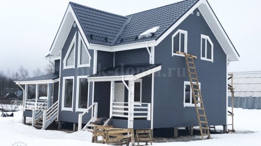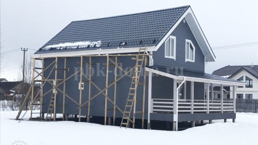 В комплектацию дома вошло: фундамент - железобетонные сваи, обвязка, лаги, черновой пол обработаны антисептиком, каркас, межэтажные перекрытия, стропильная система камерной сушки, утепление 200 мм плитным утеплителем, кровля металлочерепица, наружная и внутренняя отделка, окна, двери, водосточная система, снегозадержатели, покраска снаружи, доставка, монтаж.