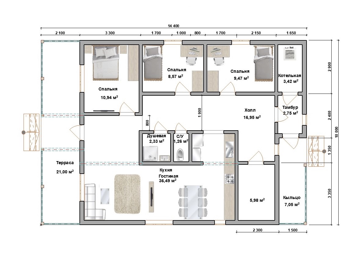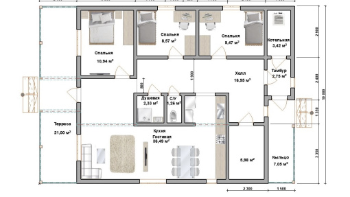 Геннадию Александровичу понравился наш типовой проект одноэтажного каркасного дома 13х9м «Арда». Мы внесли в него несколько изменений, согласно пожеланиям Заказчика, и увеличили проект до 14х10м. В доме имеется три спальни, два сан.узла, котельная, кладовая и большая кухня-гостиная. Дом получился шикарный и будет радовать всю семью долгие годы.