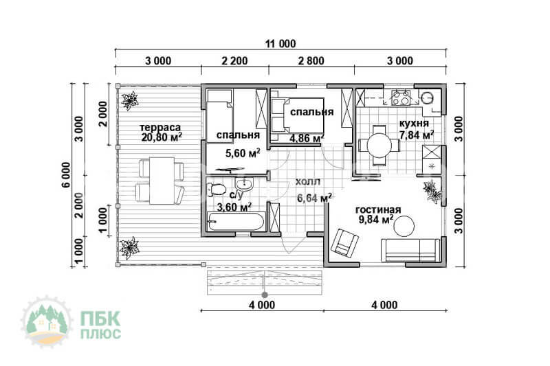 Одноэтажный дачный дом из бруса «Замбези» 11х6