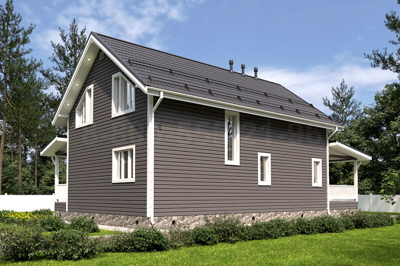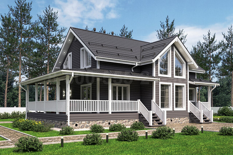 В дизайне экстерьера дома прослеживаются монументальные черты. Изящная скатная крыша успешно украшает дизайн, делая его респектабельным. Первый этаж дополнен просторной крытой террасой, которую можно обставить плетеной и мягкой уличной мебелью, чтобы создать локацию для отдыха на свежем воздухе. Неподалеку расположилось крыльцо, с которого открывается вход в дом. Фасад дополнен окнами разного размера, которые прекрасно пропускают солнечный свет. Изящность дома подчеркнут дорожки, мощеные камнем, вечнозеленые растения и насыщенные цветочные клумбы.