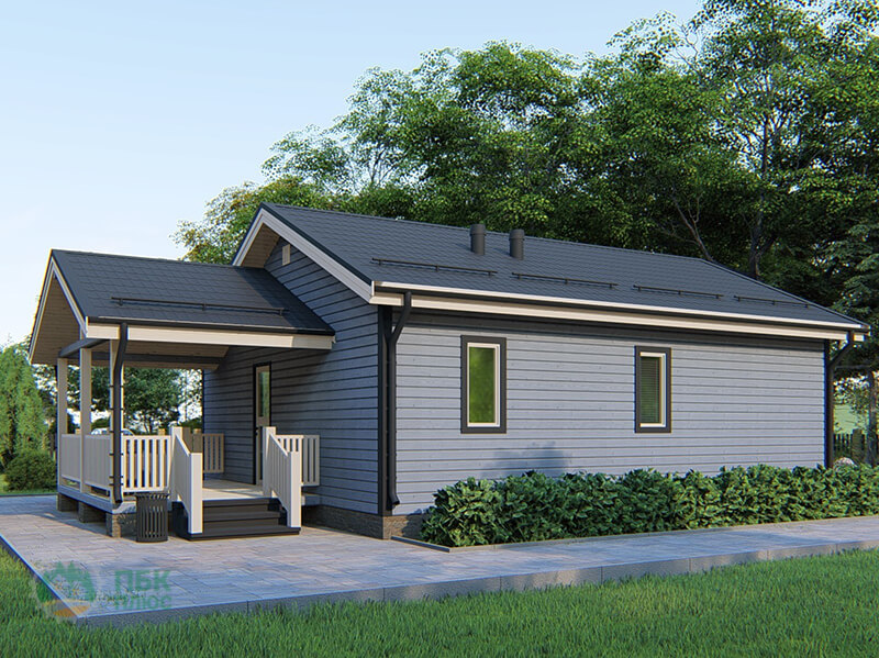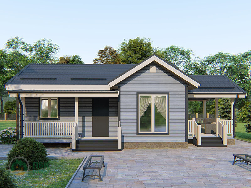 Внутри дома обустроены две просторные спальни для отдыха, работы и детских игр. Помещения объединяет холл, который можно обставить мебелью, напольными и настенными системами для хранения вещей. Просторная кухня оставляет возможность для зонирования и создания обеденной зоны со столом, стульями или мягким уголком. Светлая гостиная позволяет приятно проводить время в кругу друзей или семьи.