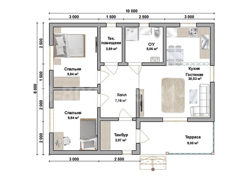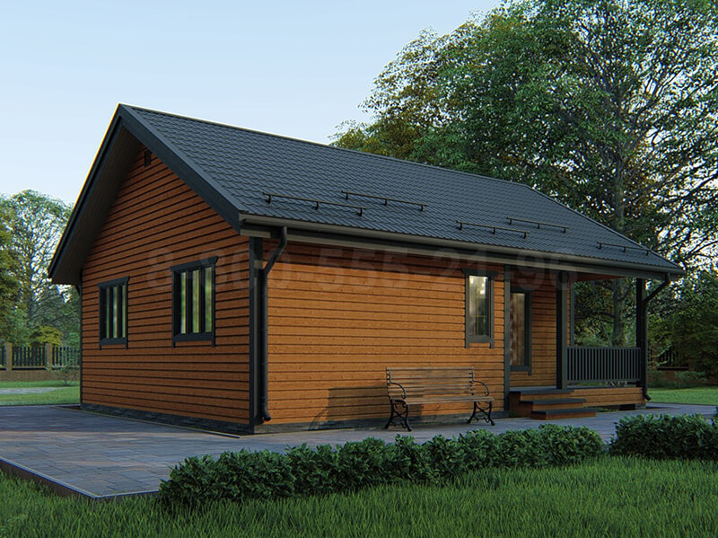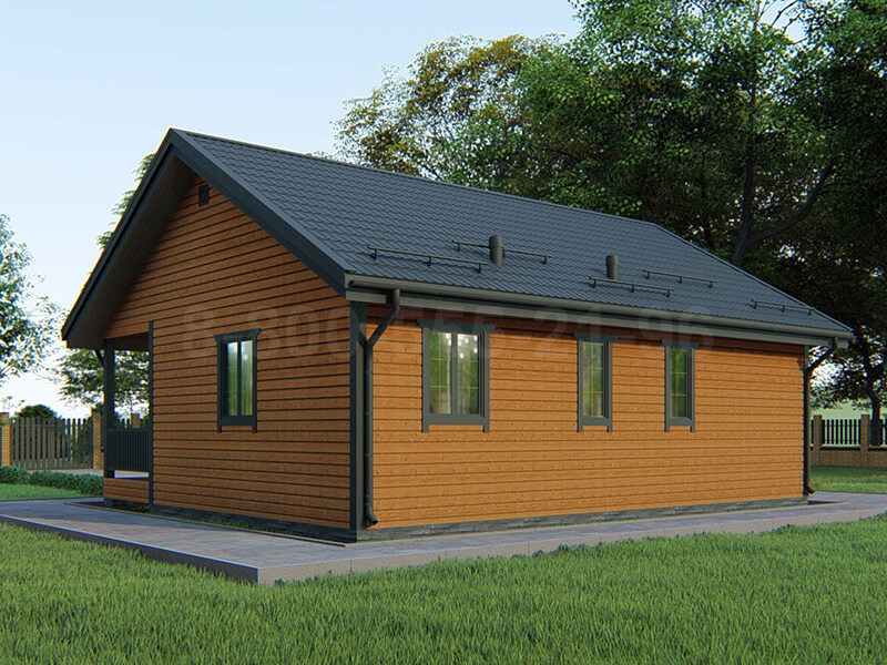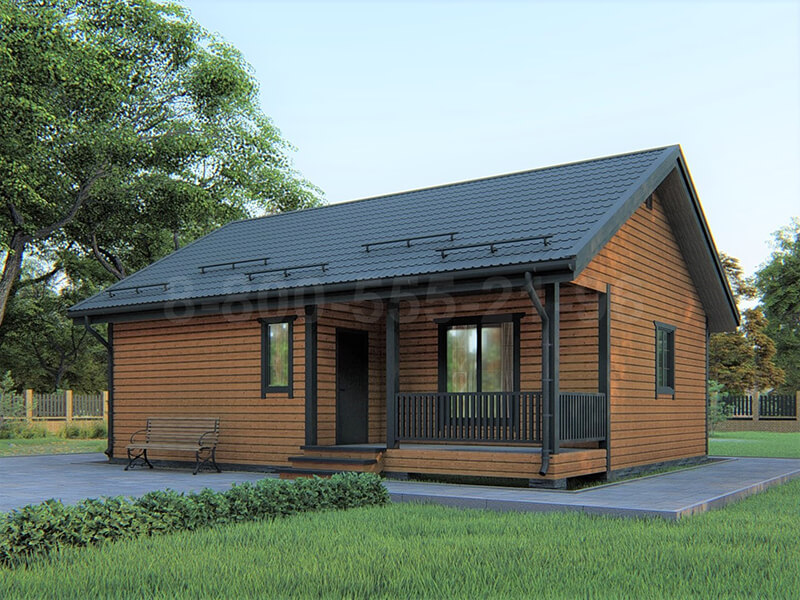 При входе в дом мы попадаем в тамбур из которого переходим в просторный холл. Рядом расположены гостиная-кухня, в последней можно обустроить зону для приема пищи со столом и мебелью. В доме предусмотрены две просторные изолированные спальни, благодаря чему хозяев не будут беспокоить шум и характерные запахи. В доме имеется совмещенный санузел и техническое помещение.